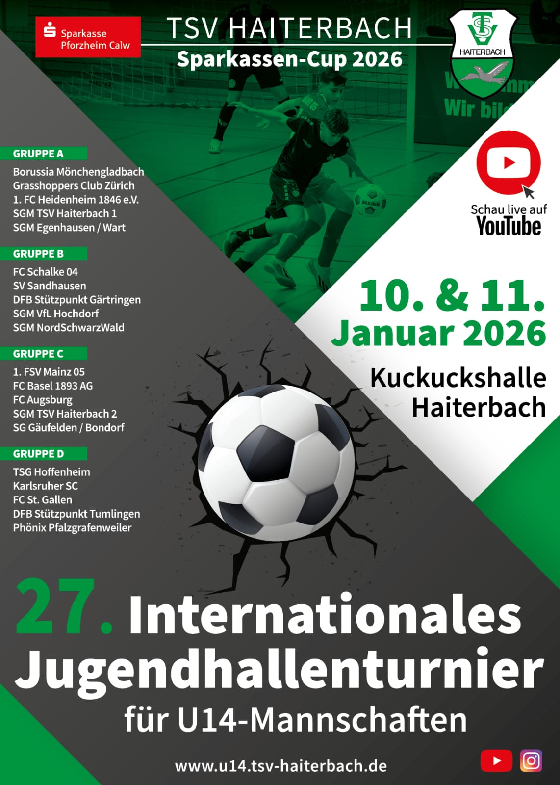 Am 10. und 11. Januar 2026 wird die Kuckuckshalle Haiterbach wieder zum Treffpunkt internationaler Nachwuchstalente. Bei der 27. Auflage unseres Turniers treffen Bundesliga-NLZs, starke Schweizer Teams, Auswahlmannschaften und regionale Vereine aufeinander – schneller, intensiver und spannender Jugendfußball ist garantiert. ⚽🔥